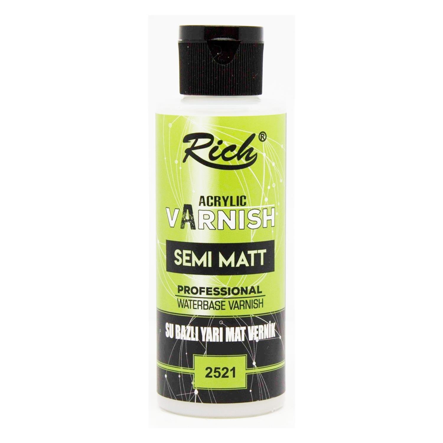 Rich Su Bazlı Yarı Mat Vernik, dekorasyon ve sanatsal hobi çalışmalarında kullanılan, kokusuz ve çevre dostu bir verniktir. Sağlığa zararlı madde içermez ve yüksek darbelere, sürtünmelere karşı dayanıklıdır. Su bazlı formülü sayesinde iç mekân kullanımına son derece uygundur.